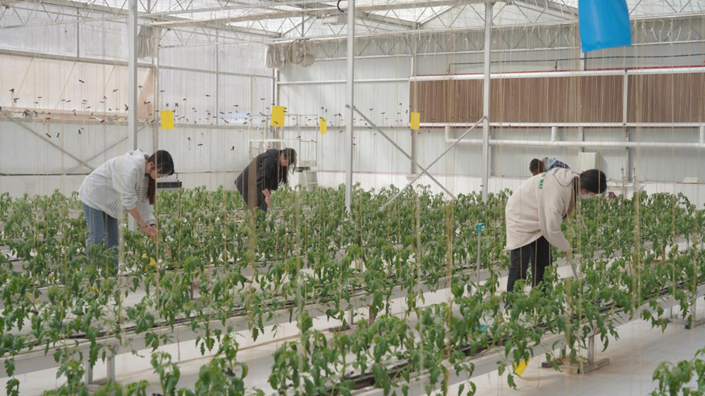 在生产示范区,教师现场演示植株生长角度调节技巧,指导同学们根据植株高度实时调整吊秧带松紧度,保持生长点垂直向上的一致性。学生分组协作实施标准化操作,项目涉及种植槽滴灌带整理、西红柿植株打叉吊秧等内容。劳动现场气氛热烈,操作演示频繁,学生们深刻体会到设施番茄精细化管理对于提升果实品质的关键作用。