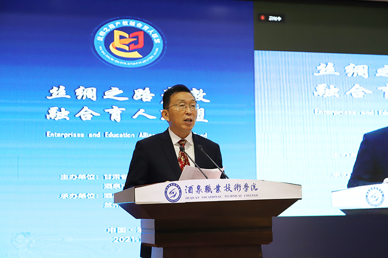 要闻快递 > 正文为深入贯彻习近平总书记对职业教育的重要指示,落实全国职业教育大会精神,全面深化产教融合、校企合作,推动“技能甘肃”建设步伐。12月24日,丝绸之路产教融合育人联盟成立大会在酒泉职业技术学院采取线上线下相结合的方式召开。酒泉市人民政府副市长赵峰出席大会。国外机构、教育部、省外院校相关单位领导出席线上会议。市政府办公室、市教育局以及甘肃省内加盟的部分职业院校、酒泉市域内部分产教融合型企业和科研院所相关领导,酒泉职业技术学院党委书记、校长易志军,酒泉职业技术学院党委委员、副校长吴建春参加大会。酒泉职业技术学院党委委员、副校长王立智主持会议。