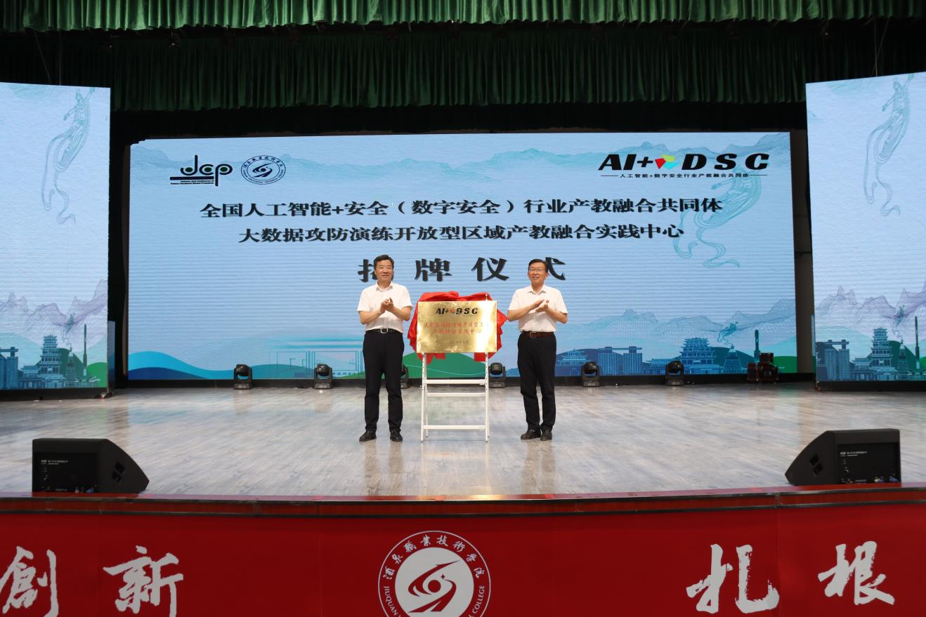 工业和信息化部网络安全产业发展中心相关领导与酒泉职业技术学院党委书记易志军共同为全国人工智能+安全(数字安全)行业产教融合共同体大数据攻防演练开放型区域产教融合实践中心揭牌。