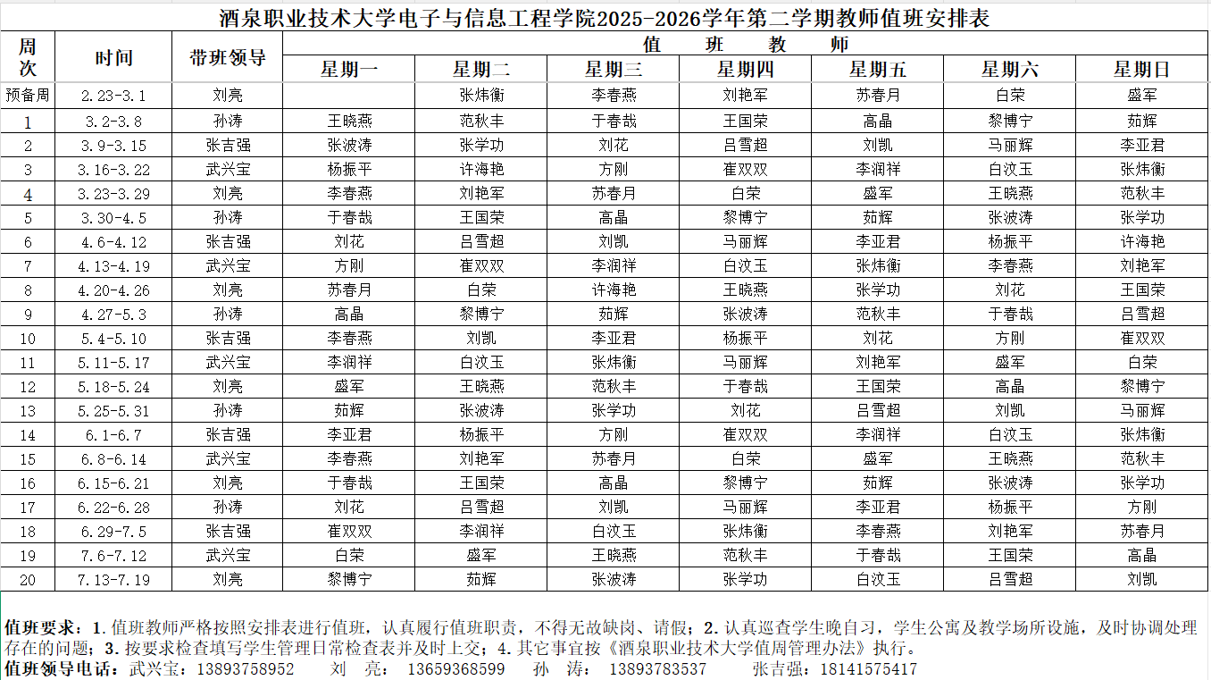 电子与信息工程学院2025-2026学年第二学期教师值班安排表
