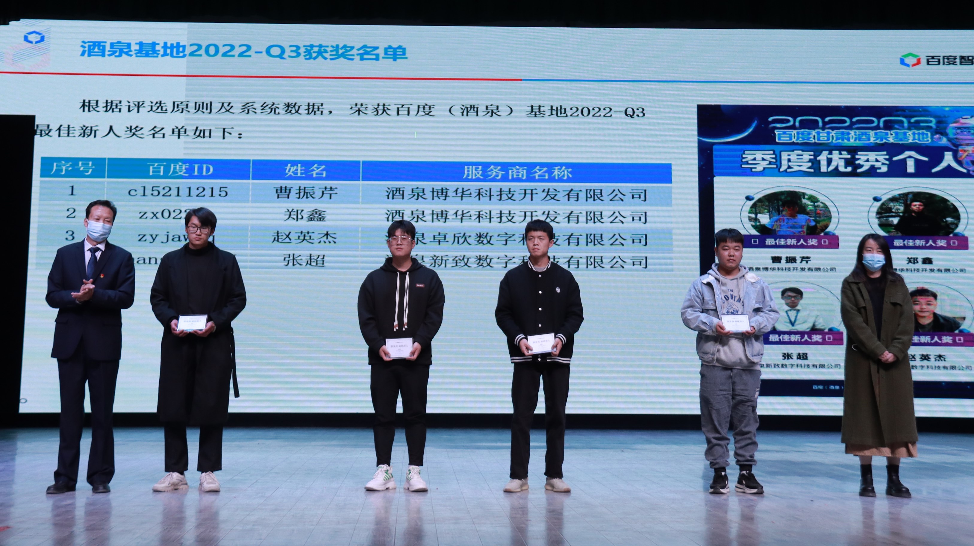 晚会中为荣获百度智能云(甘肃酒泉)人工智能基础数据产业基地第三季度最佳新人奖2020级实习学生曹振芹、郑鑫、张超,2019级毕业生赵英杰颁奖,学院党支部书记、院长武兴宝教授,百度数据产业基地行政运营经理聂翠玲女士为获奖的实习同学颁发了奖牌。