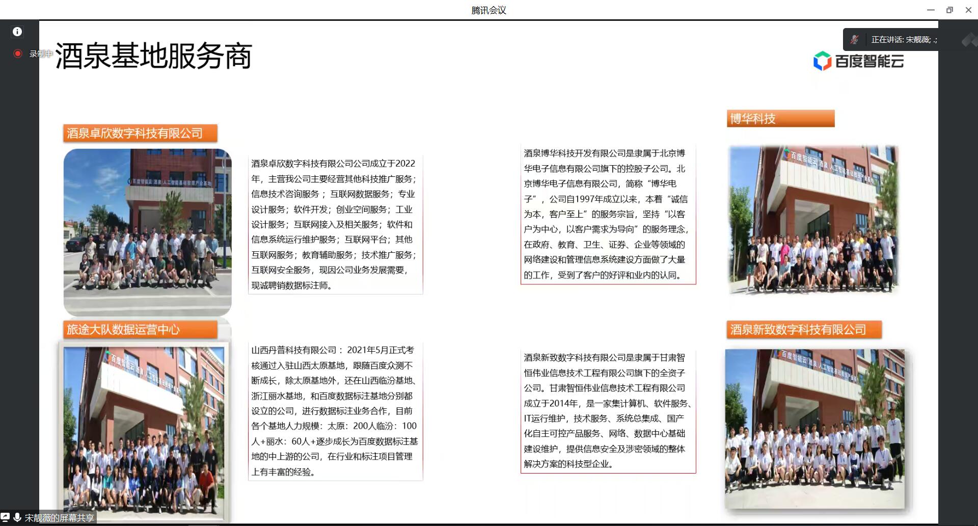 百度智能云(酒泉)人工智能基础数据产业基地有酒泉博华科技有限公司、酒泉新致数字科技有限公司、酒泉卓欣数字科技有限公司和酒泉丹普智数网络科技有限公司四家公司。主要从事2d数据标注、3d数据标注、标注质检、数据中心基础建设维护等业务。基地已与我院达成长期合作协议,为我院学生提供优质的就业岗位。会上,百度及各公司领导从企业文化、晋升空间、行业发展、人才培养、薪资待遇等方面对基地及公司进行了详细介绍,同学们积极与公司进行沟通,充分了解企业的企业岗位信息,表达自己的求职意向。
