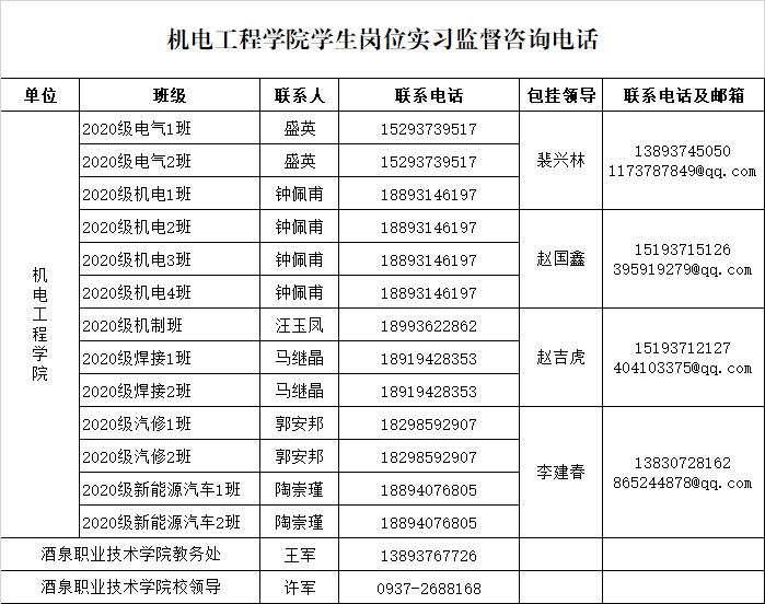 为进一步规范我院学生岗位实习管理,维护实习各方的合法权益,发挥社会公众监督作用,根据《职业学校学生实习管理办法》《职业院校学生实习管理准则》等有关要求,现将我院各班级指导教师、学院领导和学校教务处及分管校领导的监督咨询电话、邮箱予以公告。