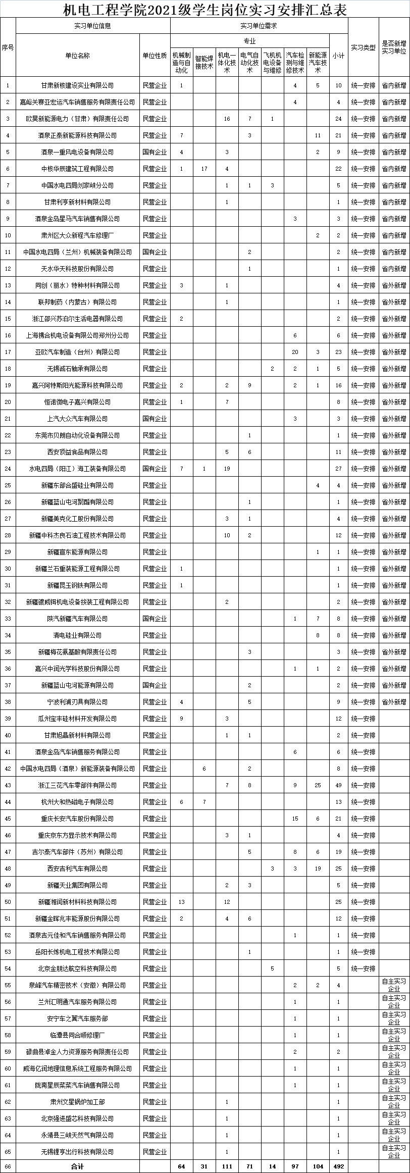 根据《教育部等八部门关于印发〈职业学校学生实习管理规定〉的通知》(教职成〔2021〕4号)和《甘肃省职业学校学生实习管理实施细则》(甘教职成〔2022〕2号)文件精神。经学校党委会议审议通过,机电工程学院2021级学生集中实习安排54家实习单位,经学生自主申请办理11家实习单位,共计65家实习单位均符合《职业学校学生实习管理规定》相关要求。现予以公示,接受社会监督。