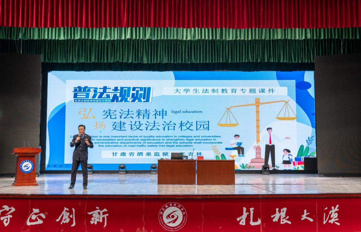 甘肃省酒泉监狱教育科一级警长任吉林同志开展了以《弘扬宪法精神 建设法治校园》为主题的专题讲座。任警官从五个方面对宪法进行了深入解读,向学生普及了宪法知识,同时结合生动鲜活、令人警醒的案例以案释法,提醒广大青年学子增强法律意识,自觉遵守国家法律法规及社会公共规范,学会明辨是非、识别善恶,自觉抵制各种不良行为及违法犯罪行为的诱惑和侵害。鼓励同学们积极参与到法治社会建设中来,通过实际行动,将法治精神内化于心、外化于行。
