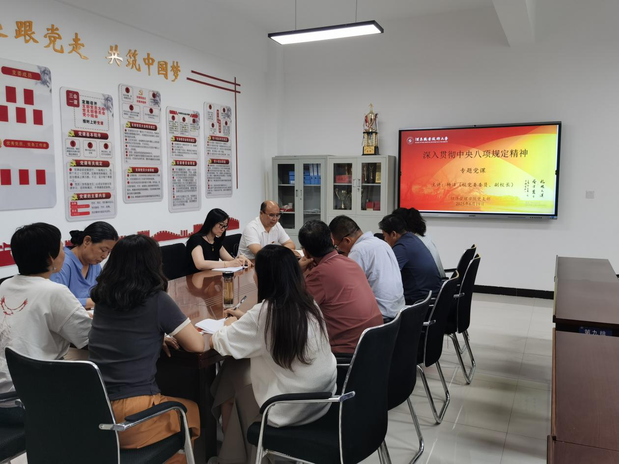 2025年6月19日下午,学校党委委员、副校长杨洁同志为经济管理学院全体党员上专题党课。按照校党委深入贯彻中央八项规定精神学习教育安排,杨洁副校长结合学校、学院贯彻中央八项规定精神学习教育实际,为经济管理学院全体党员上了一节严肃而又生动的专题党课。经济管理学院党支部全体党员参加了学习。