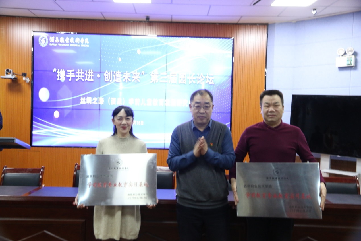 会上,酒泉市实验幼儿园席忠红园长、赵多生院长及蔺燕老师分别就“示范幼儿园发展”、“服务酒泉教育事业,实现高质量发展”、“1+X”幼儿照护专业技能培训进行了专题报告。同时,学校与陈思思古筝艺术学校等五家企业进行产教融合、校企合作签约仪式,并颁发校外实习就业指导教师聘书及为校外实习基地授牌。