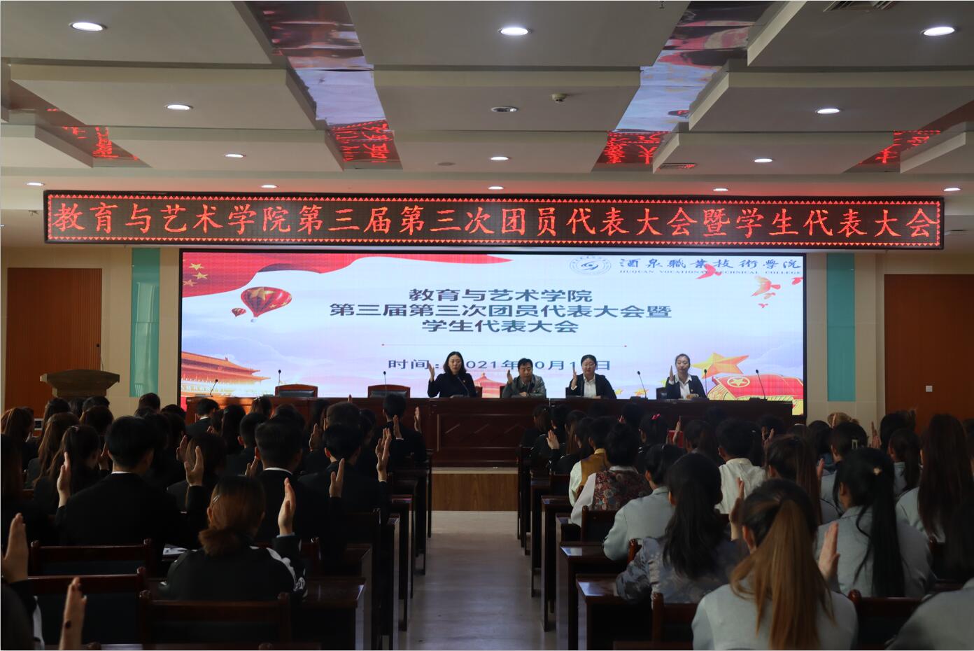 2021年10月11日,教育与艺术学院在图书馆四楼会议室召开第三届第三次团员代表暨学生代表大会,学院201名团学代表、党支部副书记梁志红、团委书记袁霓、学生管理办公室主任段君妍参加会议,会议由副院长张冬琴主持。
