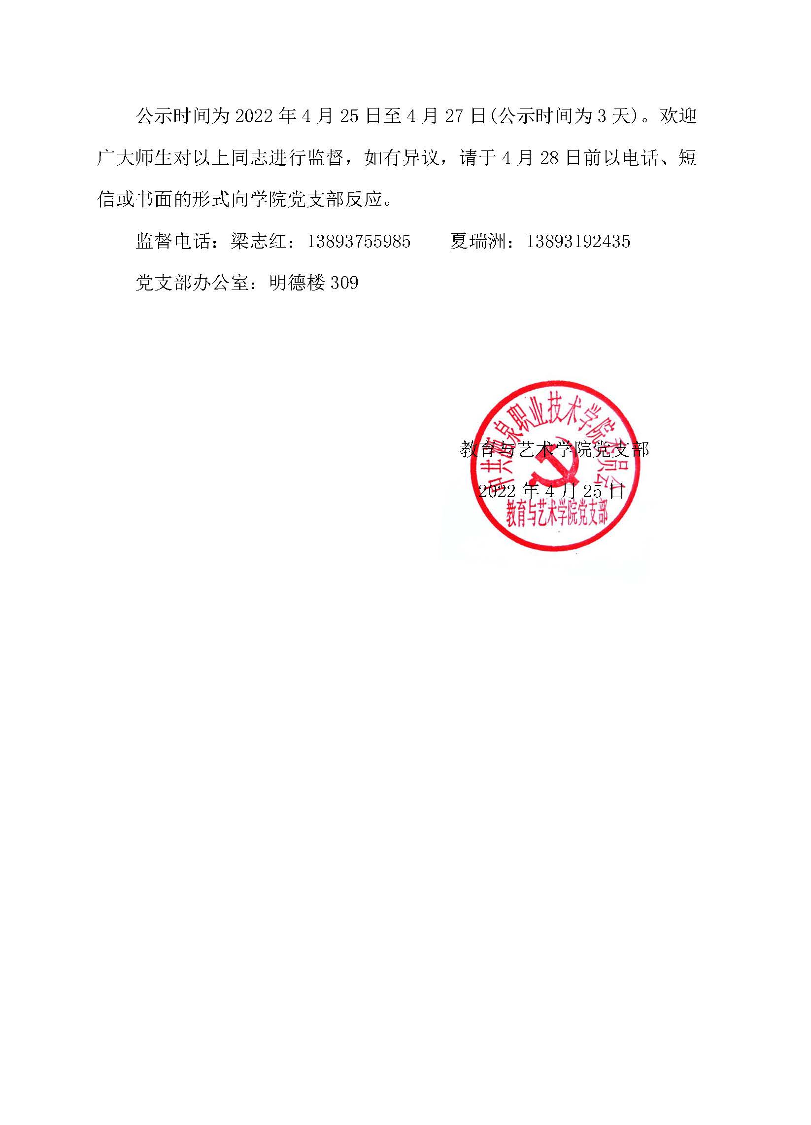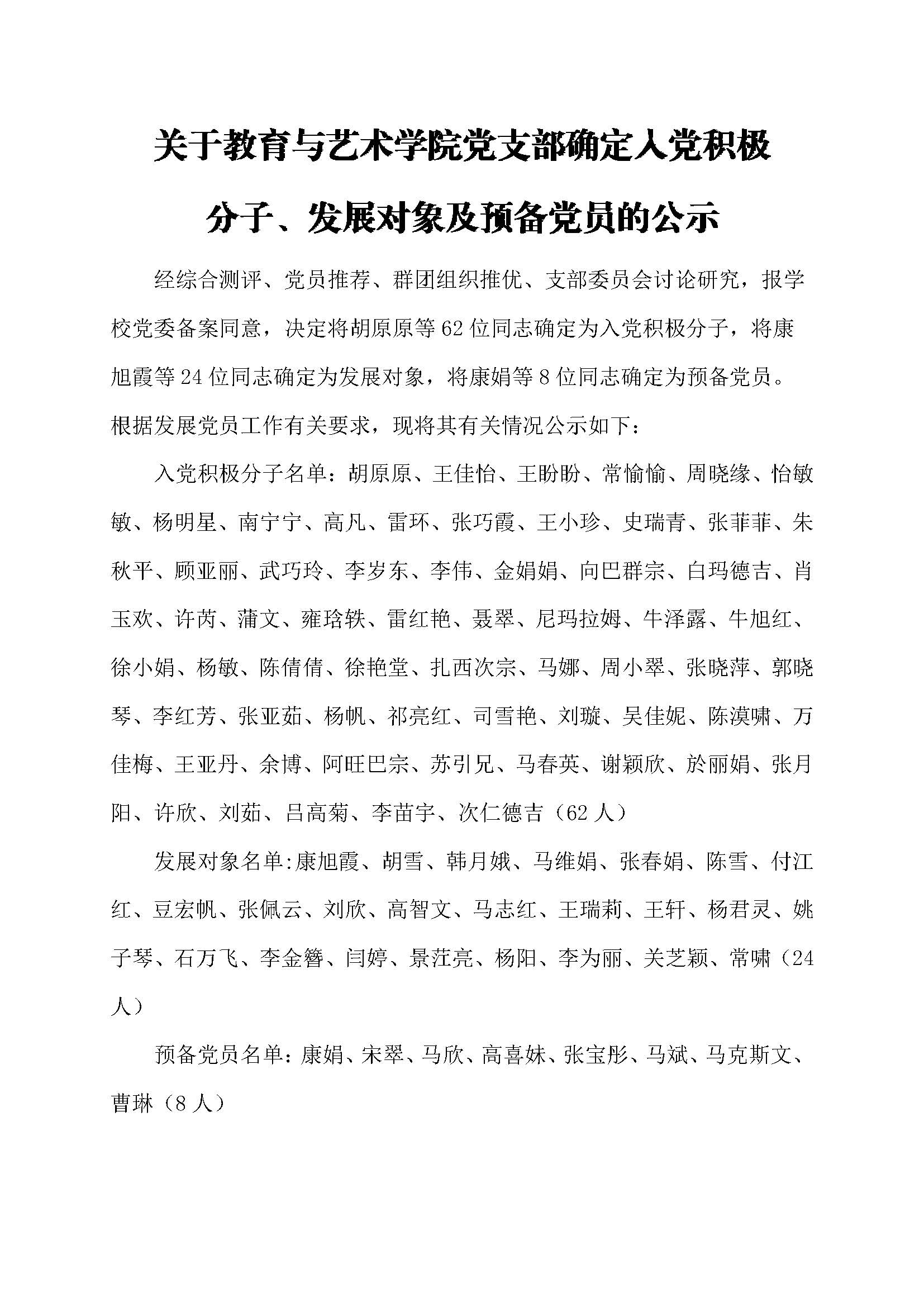 关于教育与艺术学院党支部确定入党积极 分子、发展对象及预备党员的公示