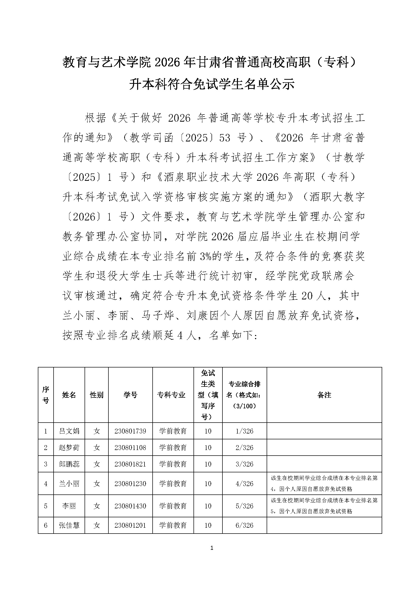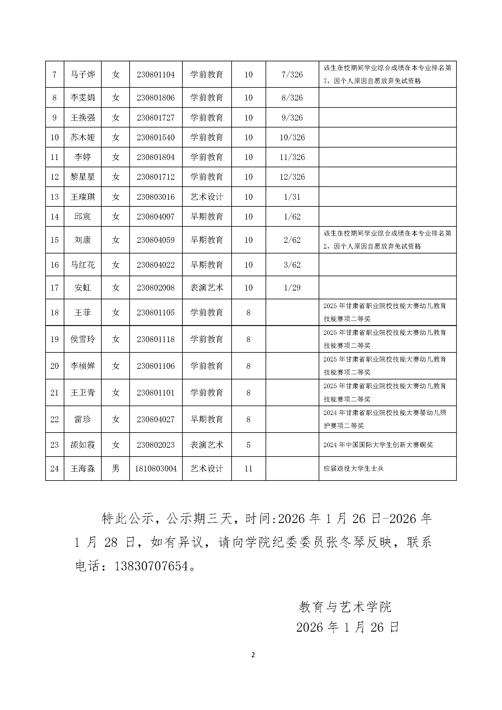 教育与艺术学院2026年甘肃省普通高校高职(专科)升本科符合免试学生名单公示.pdf
