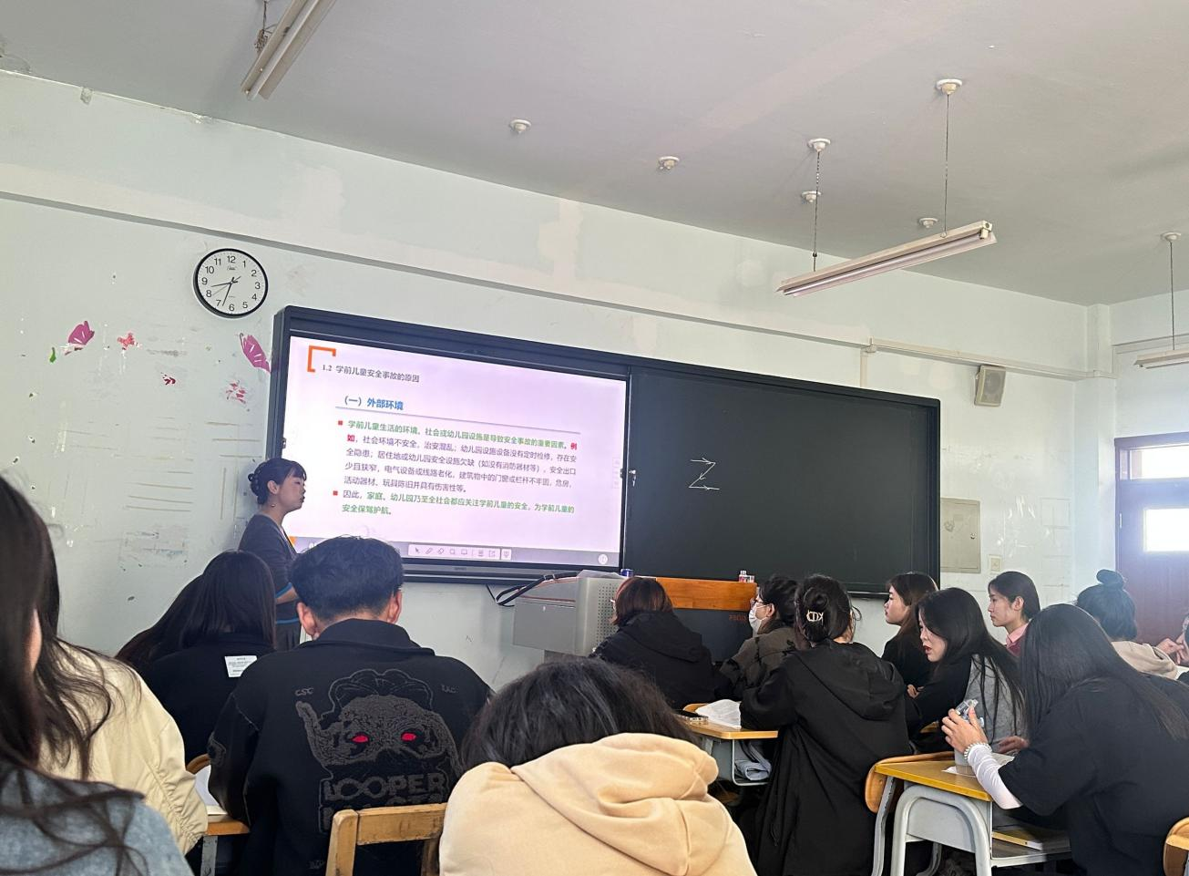 张婷老师的《书写》课,通过让学生阅读材料、观看视频、示范演练,引导学生深入了解作者所处时代的背景,分析《自叙帖》背后的艺术思想、文字用笔技法,以及所产生的深远影响;李娟老师的《学前儿童科学教育》课,详细讲解了幼儿园区域科学教育活动,课堂语言感染力强,教学脉落清晰,问题的设计有梯度、有挑战性,拓展了学生的思路,开阔了学生的视野;贺雯老师的《幼儿歌曲演唱》课,以歌曲《快乐的小蜗牛》为主题,结合学生的专业特点进行教学,与学生产生良好的互动,课堂氛围活跃,做到讲练相结合,切实提高了学生的专业知识与实践能力。