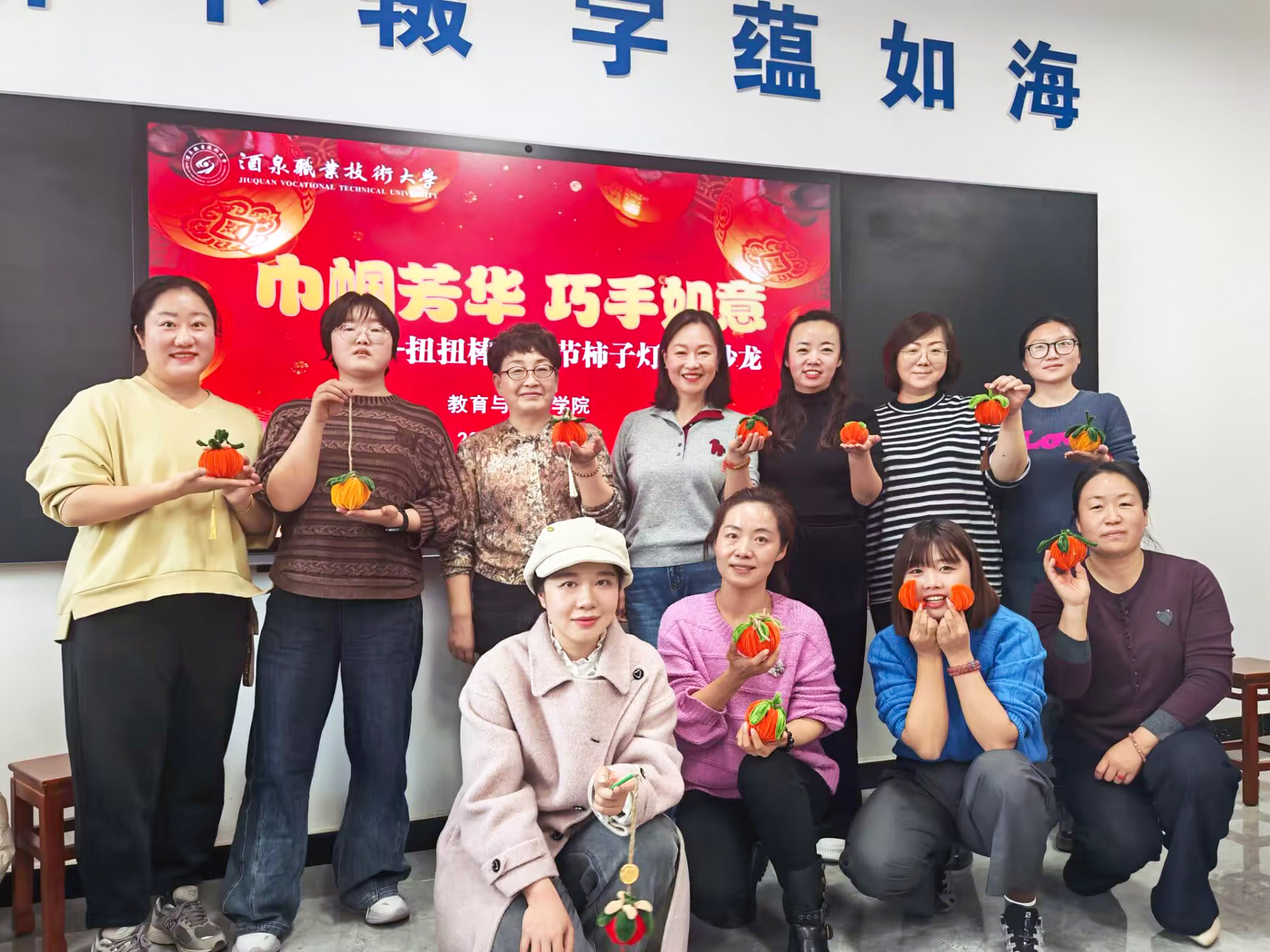为传承中华优秀传统民俗文化,喜迎元宵佳节,同时致敬学院全体女教师,迎接即将到来的“三八”国际妇女节,2026年3月3日,酒泉职业技术大学教育与艺术学院在弘毅楼A栋208室精心举办“巾帼芳华,巧手如意”——扭扭棒元宵节柿子灯手作沙龙活动,学院无课女教师齐聚一堂,在指尖创作中感受双节温情,绽放巾帼风采。