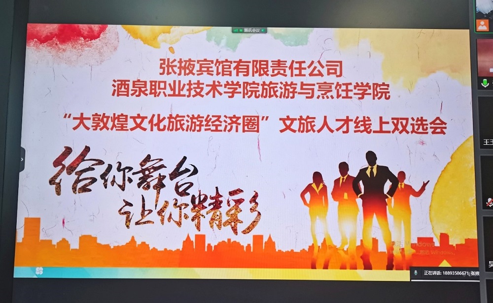 敦煌文旅集团、阿克塞文旅集团、酒泉饭店、张掖宾馆、玉门阳光酒店等企业分别进行线上宣讲,向同学们详细介绍了酒店的基本情况及岗位需求情况,并与同学们开展交流互动,就工资待遇、年假调休、晋升通道、发展空间、保险保障等问题为同学们答疑解惑。