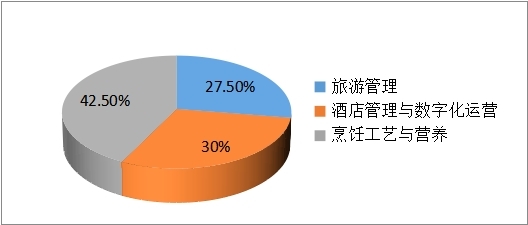 2021届毕业生有3个专业。其中,旅游管理专业54人,占27.5%;酒店管理专业60人,占30%;烹饪工艺与营养专业85人占42.5%。各专业人数比例如下表所示: