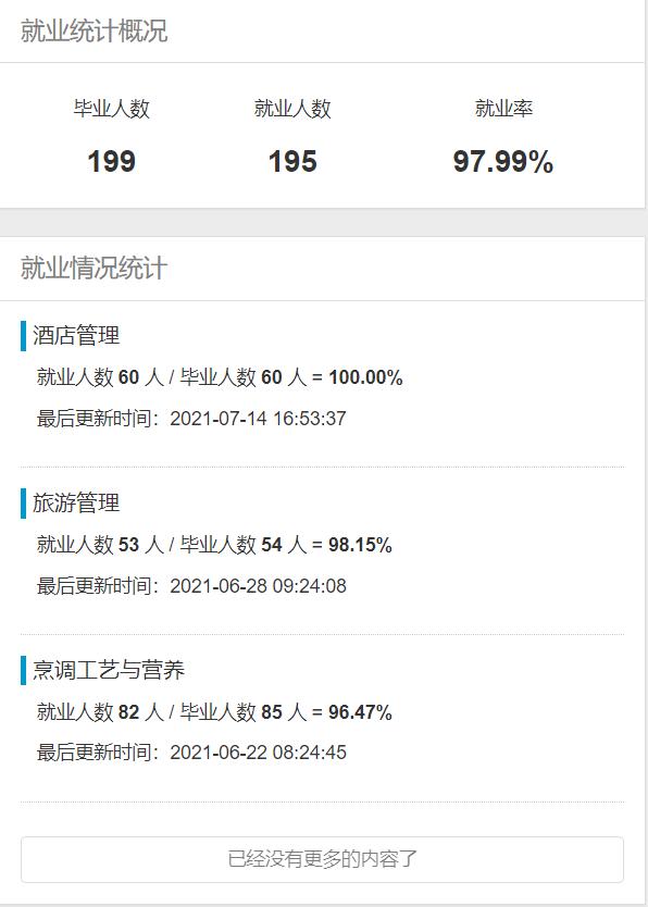 2021年旅游与烹饪学院总计199人,旅游管理专业55人,就业率:98.15%;酒店管理与数字化运营专业60人,就业率:100%;烹饪工艺与营养专业85人,就业率:96.47%。各专业就业情况如下图所示: