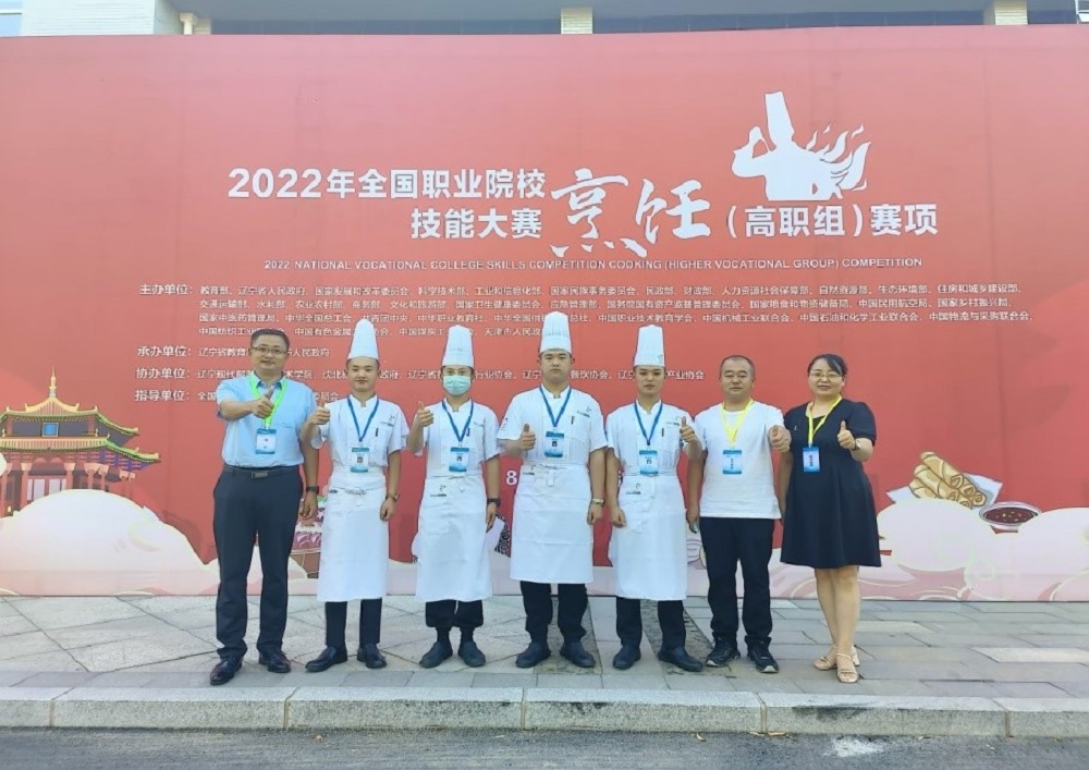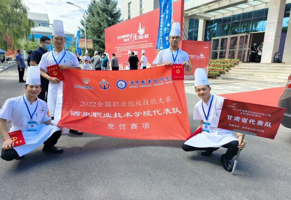 2022年8月21-24日,2022年全国职业院校技能大赛(高职组)烹饪赛项在辽宁现代服务职业技术学院举行,来自全国各省的49支代表队,共计196名选手在这里同场竞技。酒泉职业技术学院旅游与烹饪学院参赛队,代表甘肃省出征国赛。指导老师杨国斌、宋雪娇和参赛队员李志建、赵世多、权伟伟、王海超克服种种困难,发扬胡杨精神,奋力拼搏,全力备赛,做好各种突发事件的应急预案,团队最终制作的“丝路花语-----迎宾宴”在2022年全国职业院校技能大赛(高职组)烹饪赛项中挺进全国前十强(第八名),获得二等奖的好成绩,实现学校国赛成绩新突破。