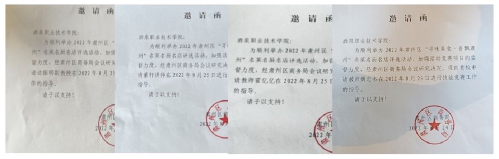 2022年8月25日,由肃州区精神文明建设指导委员会办公室、肃州区食品药品安全委员会办公室、肃州区商务局、肃州区市场监督管理局、肃州区总工会、肃州区旅游产业发展领导小组办公室联合举办的2022年肃州区“寻味美食·香飘肃州”名菜名厨名店评选活动在酒泉饭店隆重举行,我院烹饪工艺与营养专业四名教师受邀担任此次大赛的评委。