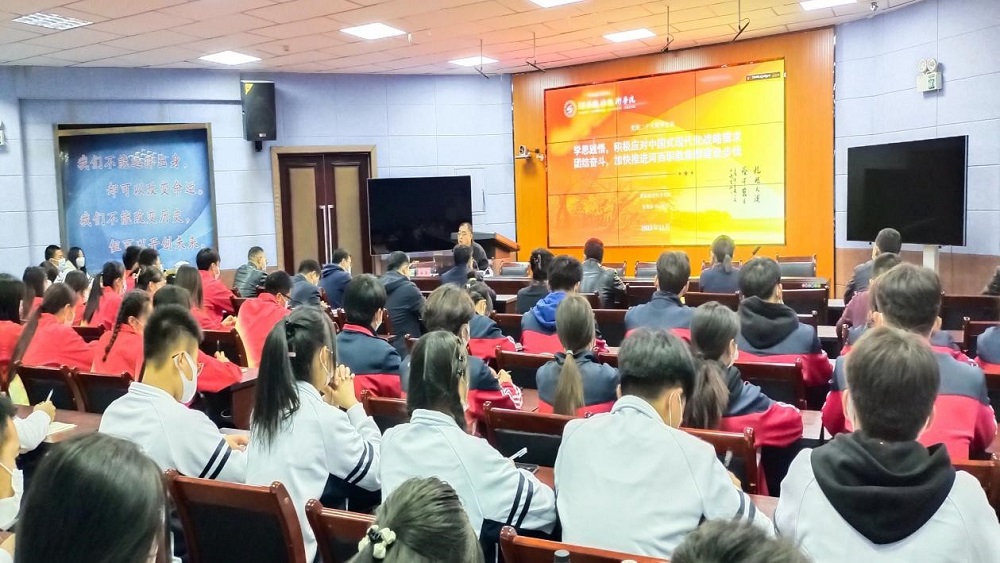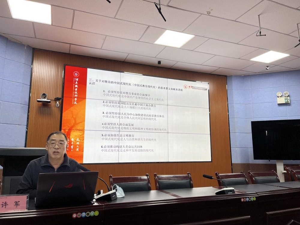 许军副书记以《学思践悟,积极应对中国式现代化战略需求。团结奋斗,加快推进河西走廊职教集群建设步伐》为题,从深刻认识党的二十大的重大意义、党的二十大关于职业教育新提法新要求的内涵解读、党的二十大关于中国式现代化的基本要求和根本遵循、关于加快推进河西走廊职教集群建设的思考四个方面进行了全面深入的宣讲。