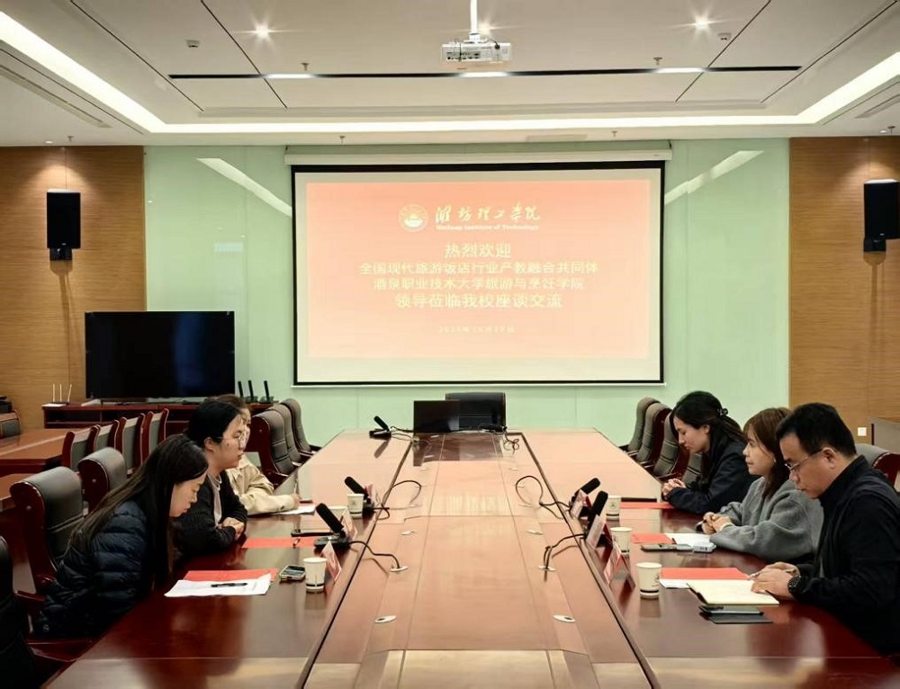 2025年10月29日,全国现代旅游饭店行业产教融合共同体副理事长单位交流活动在潍坊理工学院顺利举行。酒泉职业技术大学旅游与烹饪学院副院长杨蕊肇、共同体秘书长杨兆永(山东蓝海集团)一行到访潍坊理工学院经济管理学院,开展深度交流与合作洽谈。