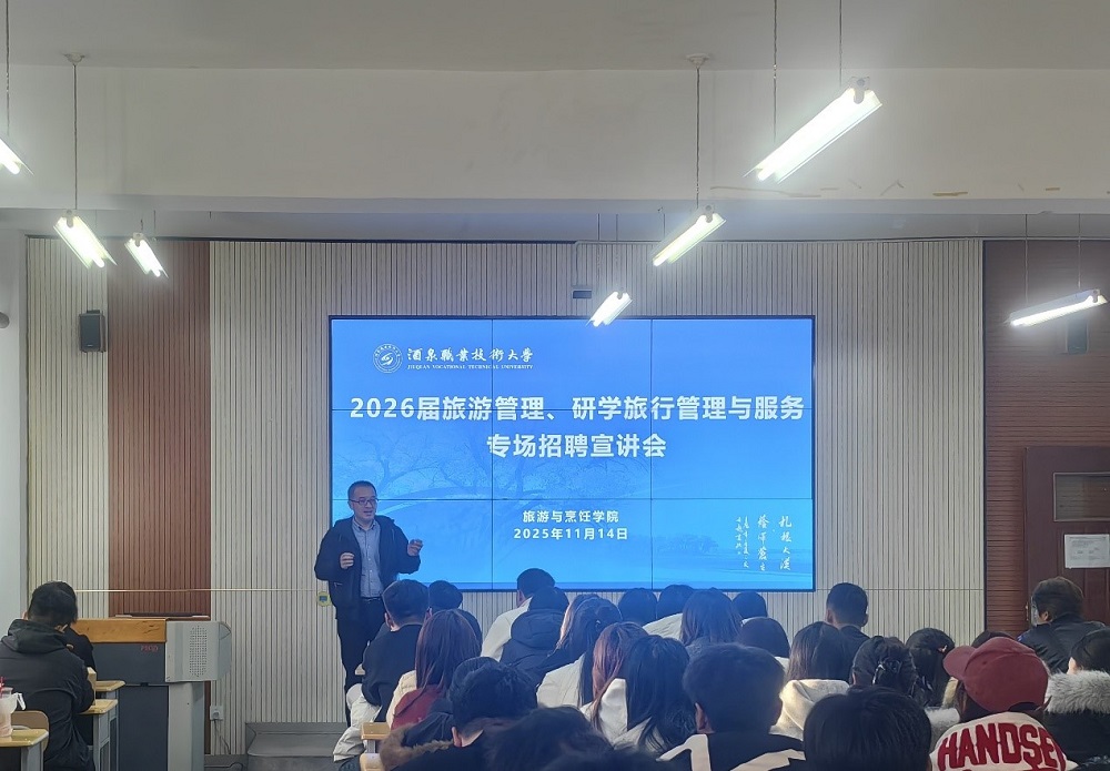 为深化校企合作内涵,精准对接行业需求,拓宽2026届毕业生就业渠道,助力学子实现高质量就业,11月14日,旅游与烹饪学院特邀首都实业投资有限公司招聘经理张庚,为旅游管理、研学旅行管理与服务两个专业举办专场招聘宣讲会。本次宣讲会吸引120余名应届毕业生到场参与,现场互动热烈、咨询踊跃,实现了企业招才与学生求职的双向赋能,取得良好成效。