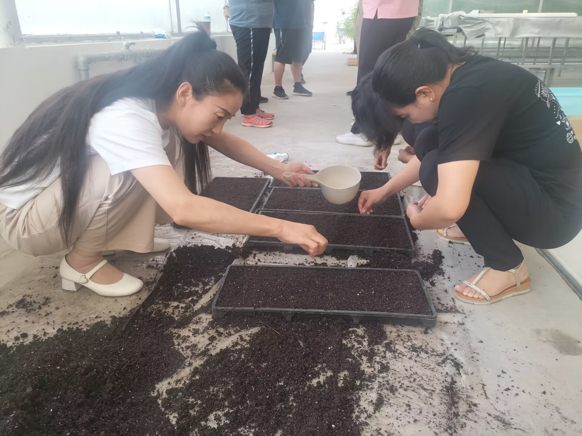 活动主要包括生菜育苗和西红柿种植园的清理;全体人员参与基质混配、填装、穴盘播种、浇水等育苗工作和西红柿种植园的清理。