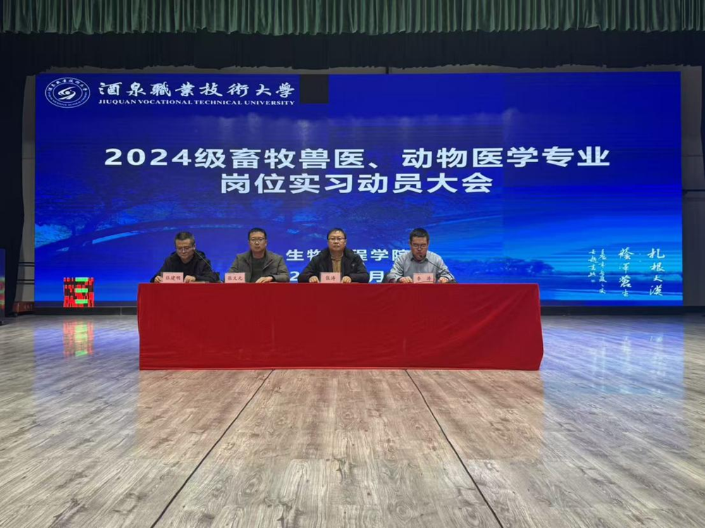 为进一步深化高技能人才培养,强化学生实践教学环节,保障岗位实习工作有序推进。生物工程学院于12月22日在胡杨文化活动中心召开2024级畜牧兽医、动物医学专业学生岗位实习动员大会。学院领导、畜牧兽医系全体教师,2024级畜牧兽医、动物医学专业共计260人参加。会议由李涛副书记主持。