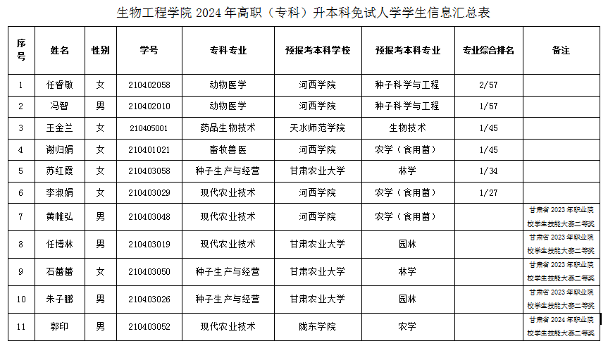 根据《关于做好2024年普通高等学校专升本考试招生工作的通知》(教学司〔2023〕15号)、《2024年甘肃省普通高等学校高职(专科)升本科考试招生工作方案》(甘教发〔2023〕3号)、《2024年甘肃省普通高校高职(专科)升本科免试生招生工作实施方案》(甘招委发〔2024〕1号)和《酒泉职业技术学院2024年高职(专科)升本科考试免试入学考生资格审定办法》有关要求,生物工程学院开展了2024年专升本免试入学资格审核确认工作。经班主任审核,生物工程学院党支部会议复审,冯智等11名学生符合2024年高职(专科)升本科免试生资格条件。现将拟推荐2024年专升本免试入学资格学生名单公示如下,若有异议,请在公示期内向相关工作负责老师反映。