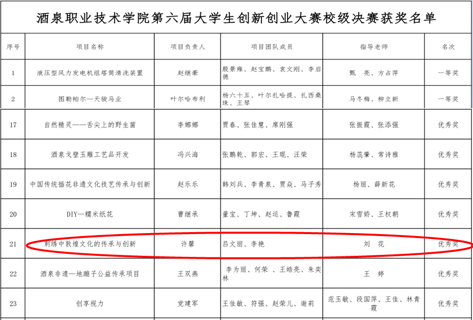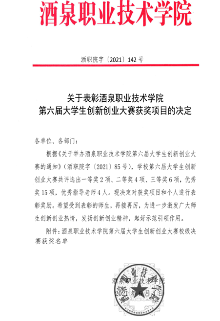 获酒泉职业技术学院第六届大学生创新创业大赛优秀奖