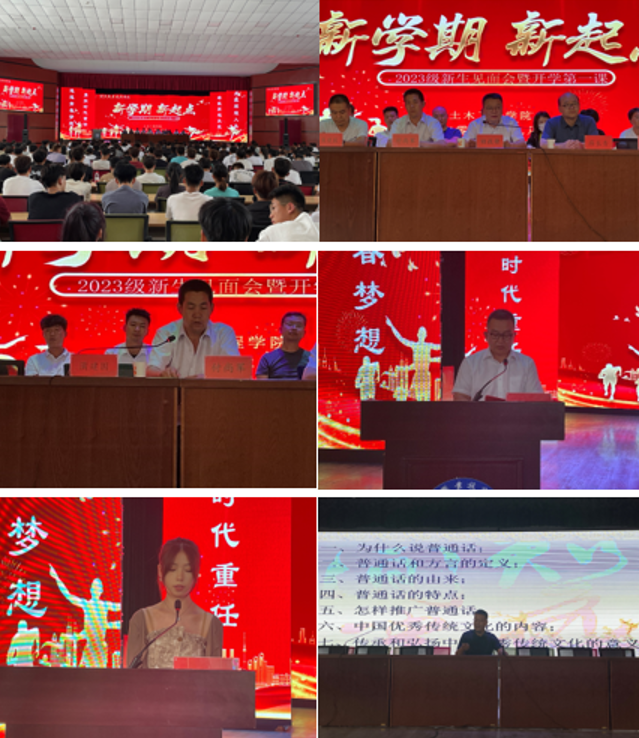 9月8日下午,土木工程学院在大学生活动中心组织新生召开了2023级新生见面会暨开学第一课。会上,土木工程学院党支部书记、院长田政锋同志对2023级新生表示了热烈的欢迎,学院党支部副书记付尚军同志介绍了学院的党团建设相关工作,副院长蔺栓保同志介绍了学生管理工作,并且对新生的日常行为习惯提出了要求和期望。新生代表吕瑞霞同学代表2023级全体新生进行了发言,表达了对未来学习、生活的期望和憧憬,并鼓励同学们端正思想、积极向上、努力奋斗,争做新时代好青年。最后,李卫东老师以“礼敬中华优秀传统文化”为主题,从普通话的推广、普通话的意义及中国优秀传统文化等方面,对2023级全体新生做了讲座。