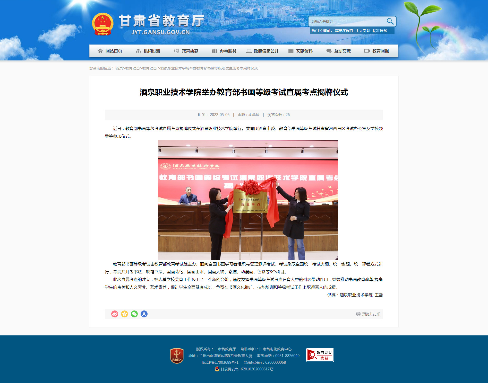 甘肃省教育厅:酒泉职业技术学院举办教育部书画等级考试直属考点揭牌仪式
