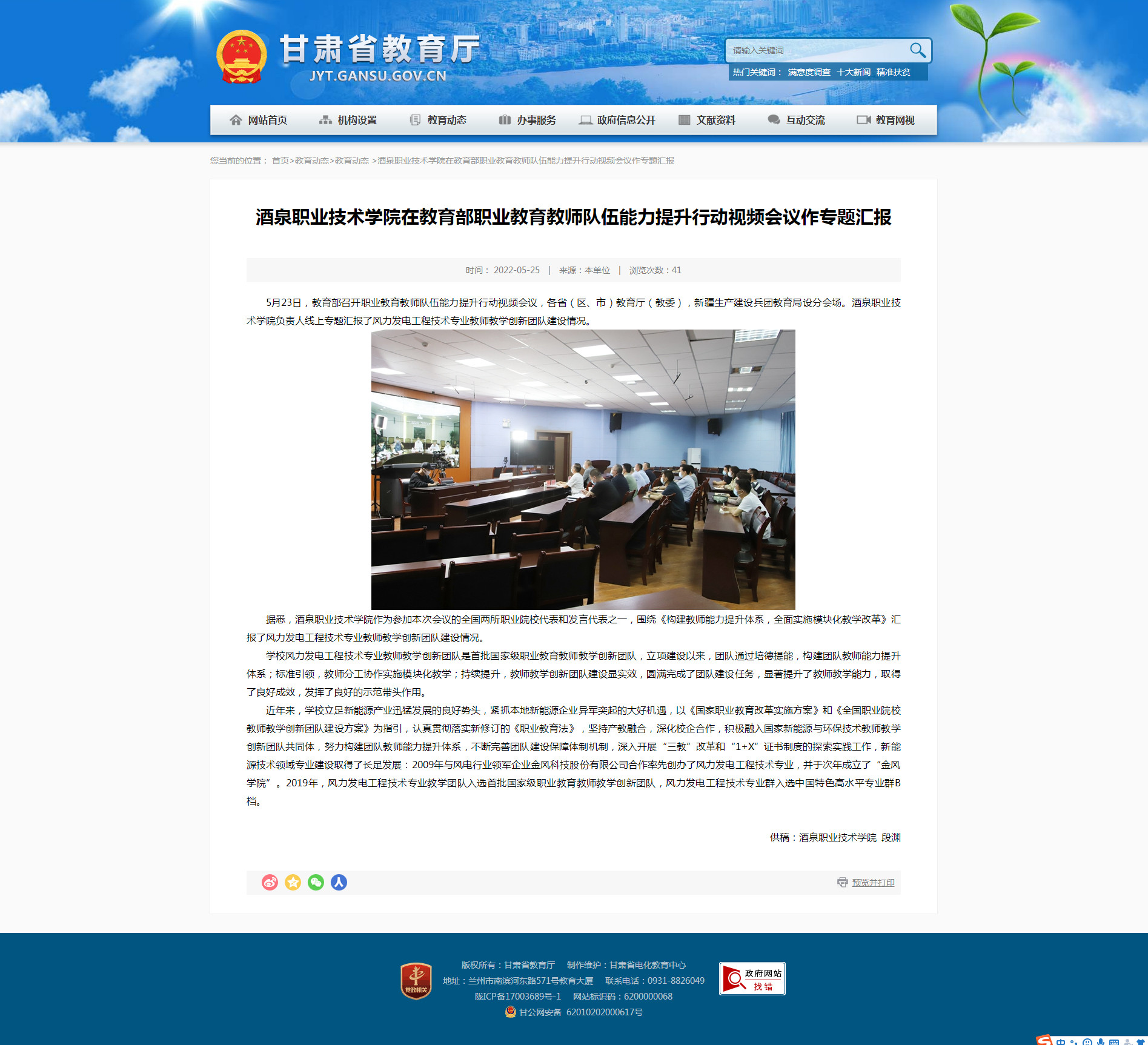 甘肃省教育厅:酒泉职业技术学院在教育部职业教育教师队伍能力提升行动视频会议作专题汇报