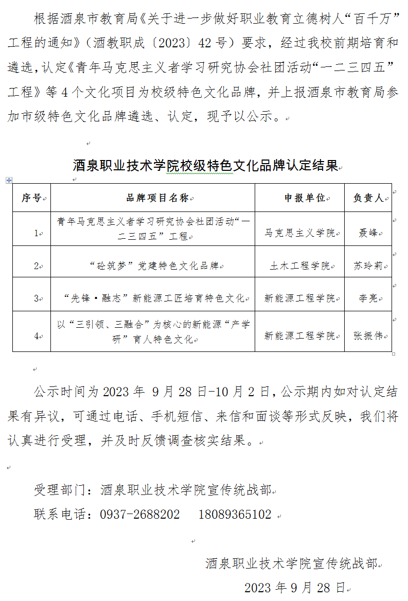通知公告 > 正文关于校级特色文化品牌认定结果的公示