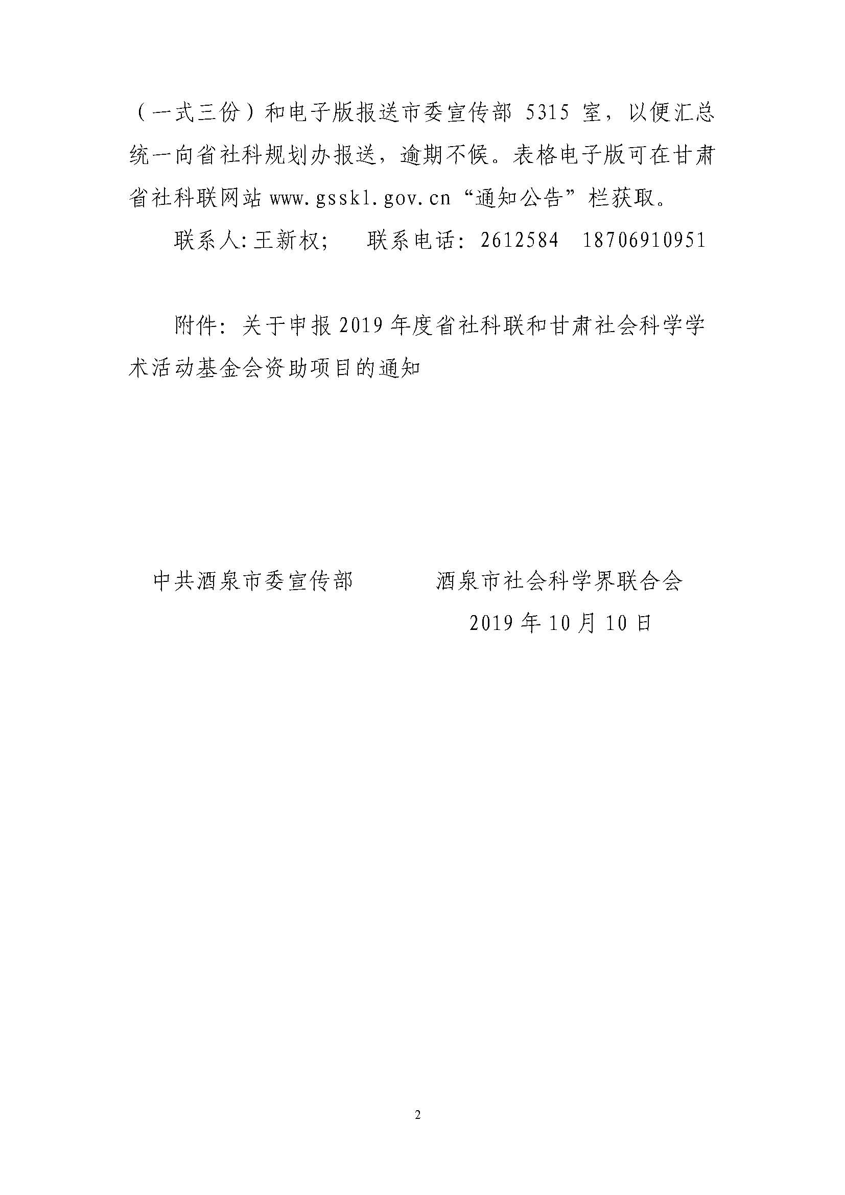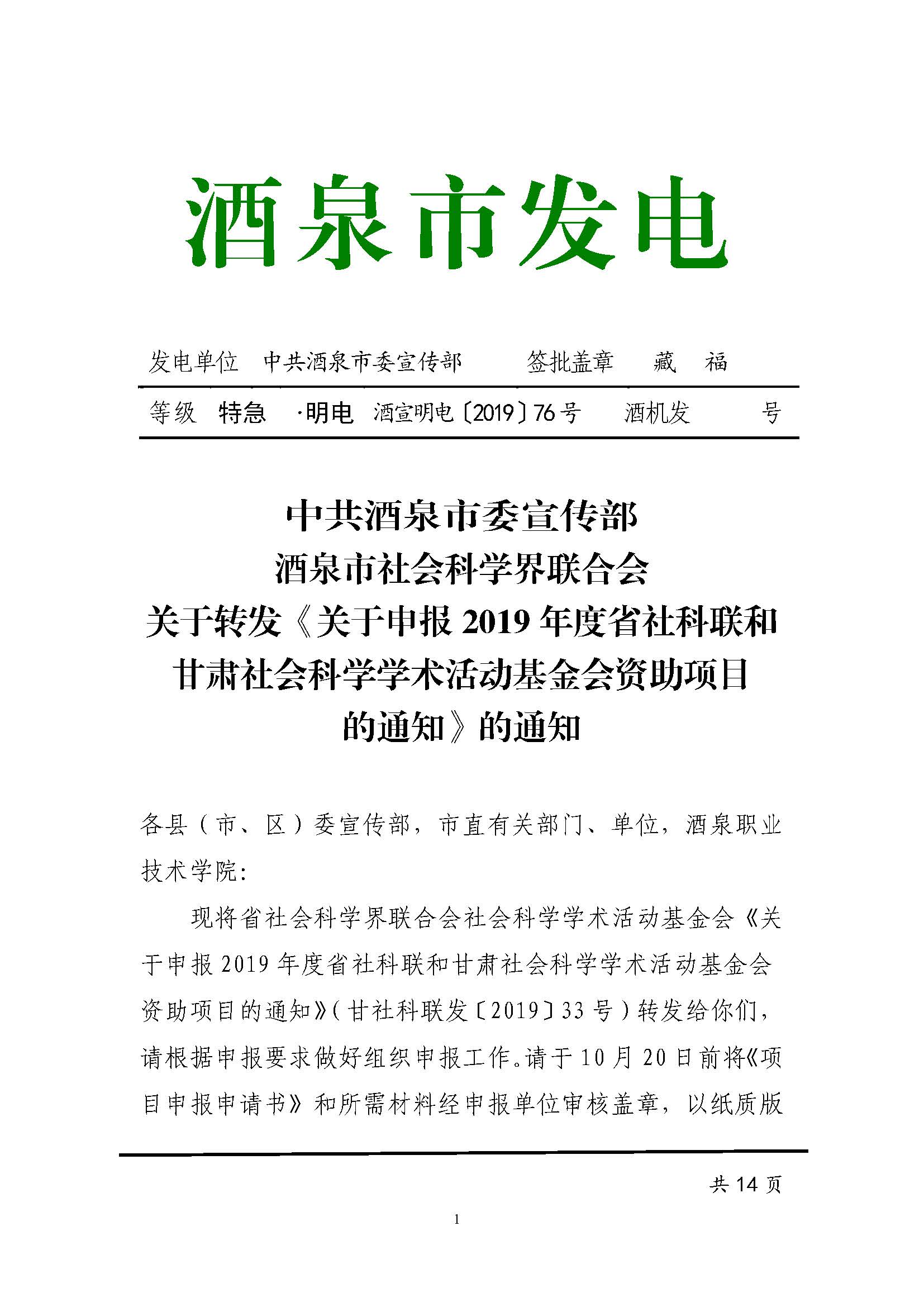 现将省社会科学界联合会社会科学学术活动基金会《关于申报2019年度省社科联和甘肃社会科学学术活动基金会资助项目的通知》(甘社科联发〔2019〕33号)转发给你们,请根据申报要求做好组织申报工作。因还需报市社科联,请于10月18日前将《项目申报申请书》和所需材料纸质版(一式三份)和电子版报送宣传统战部(