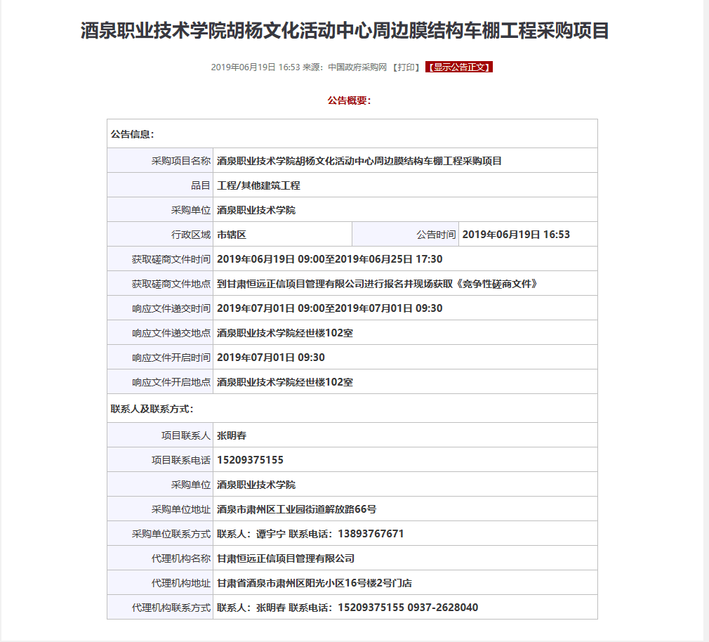 通知公告 > 正文酒泉职业技术学院胡杨文化活动中心周边膜结构车棚工程采购项目公告