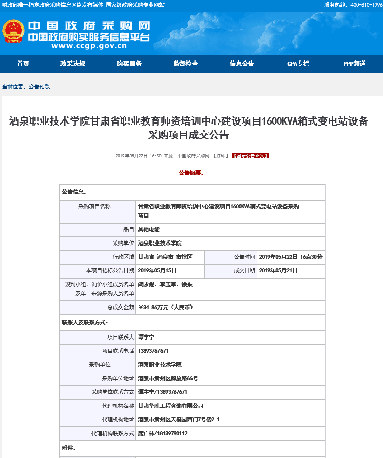 酒泉职业技术学院甘肃省职业教育师资培训中心建设项目1600KVA箱式变电站设备采购项目