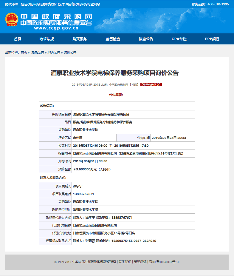 酒泉职业技术学院电梯保养服务采购项目询价公告