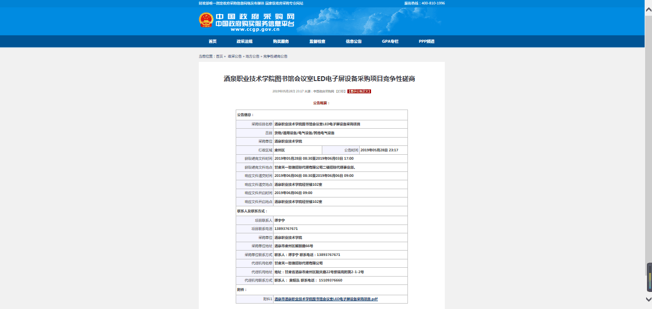 酒泉职业技术学院图书馆会议室LED电子屏设备采购项目竞争性磋商公告