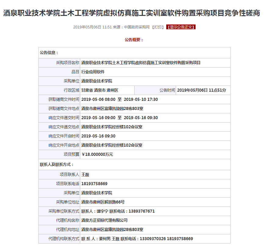 酒泉职业技术学院土木工程学院虚拟仿真施工实训室软件购置采购项目公告