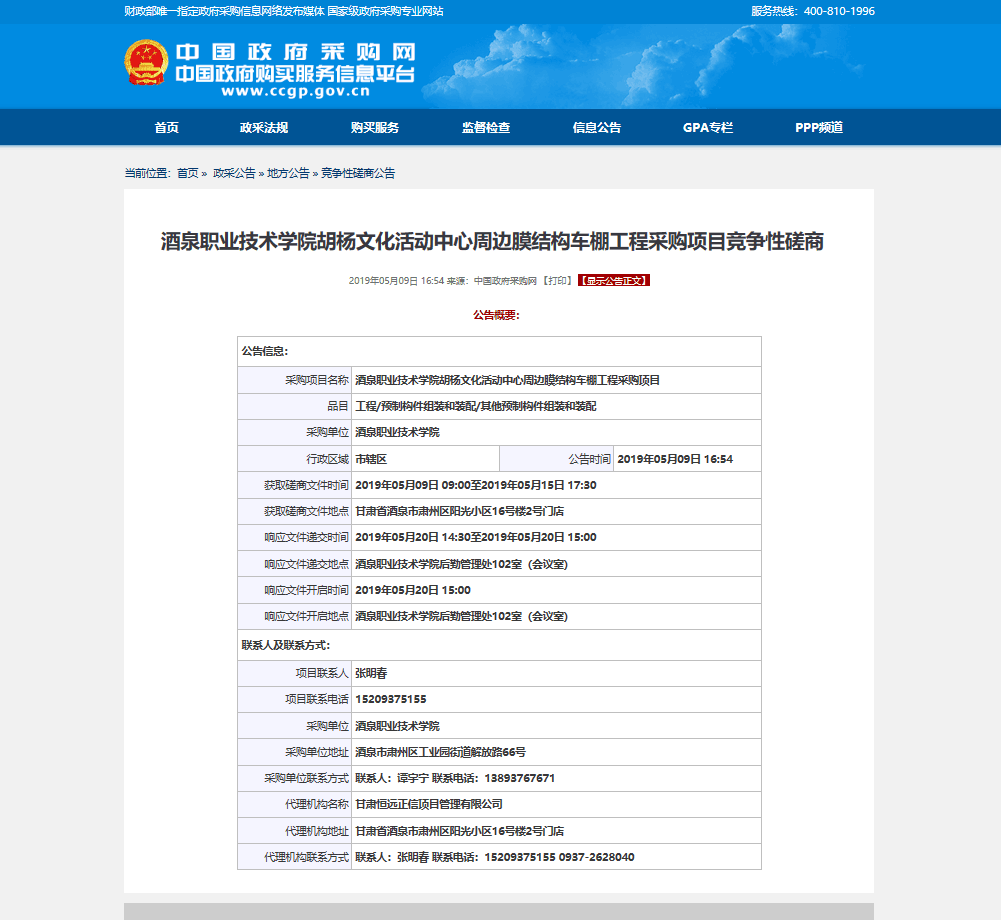 酒泉职业技术学院胡杨文化活动中心周边膜结构车棚工程采购项目公告