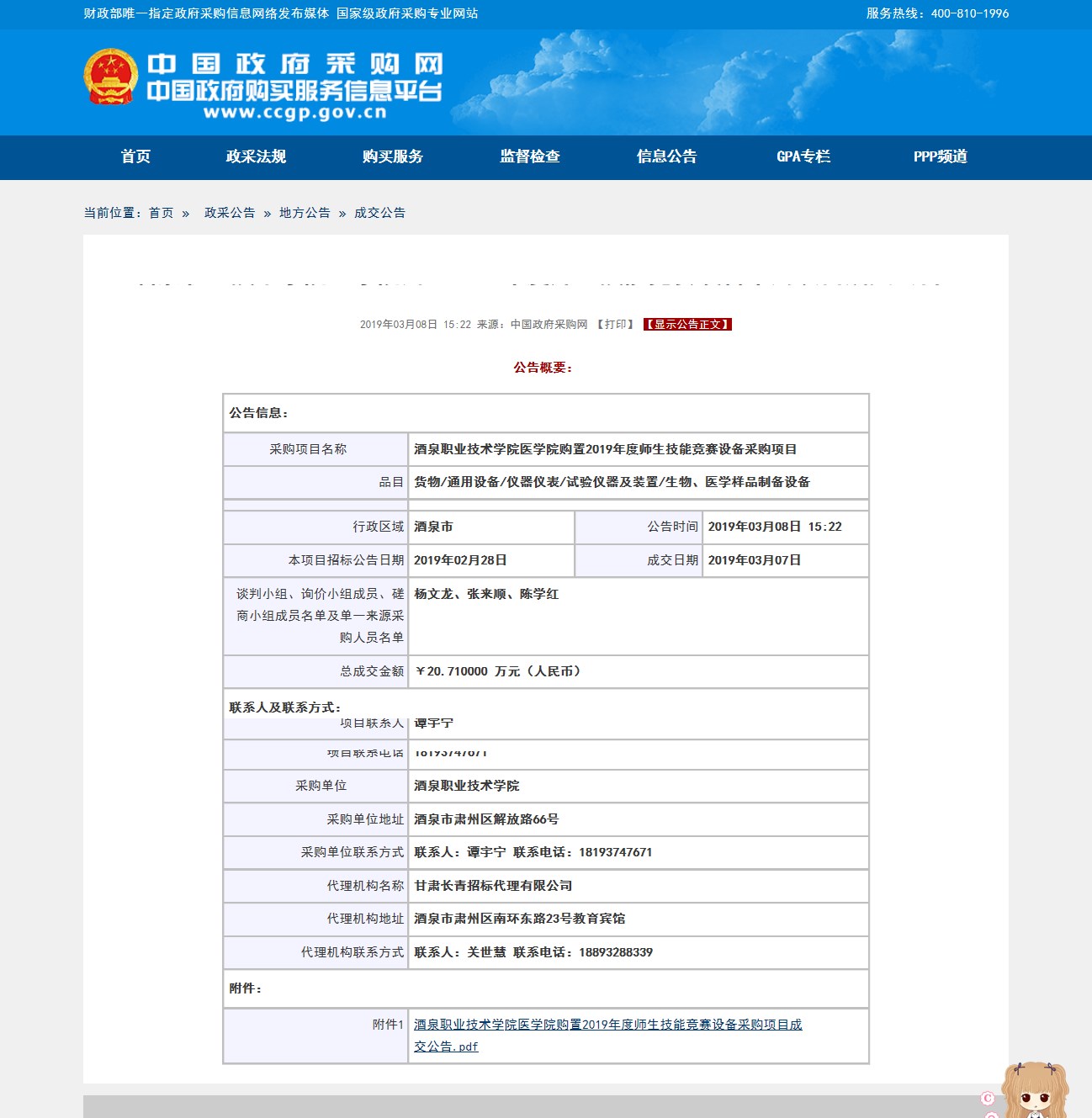 酒泉职业技术学院医学院购置2019年度师生技能竞赛设备采购项目成交公告