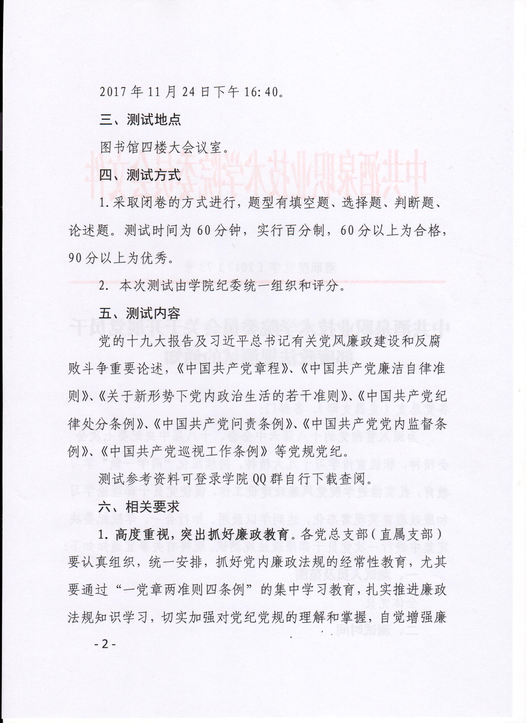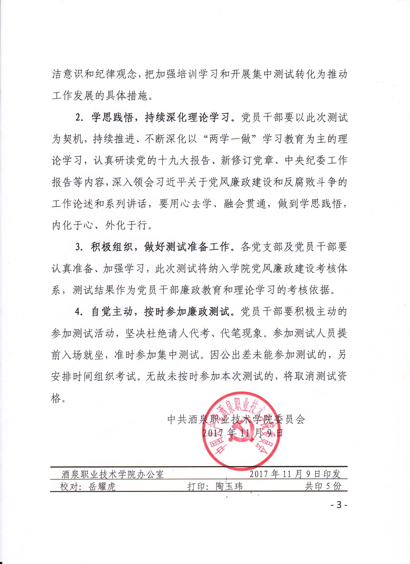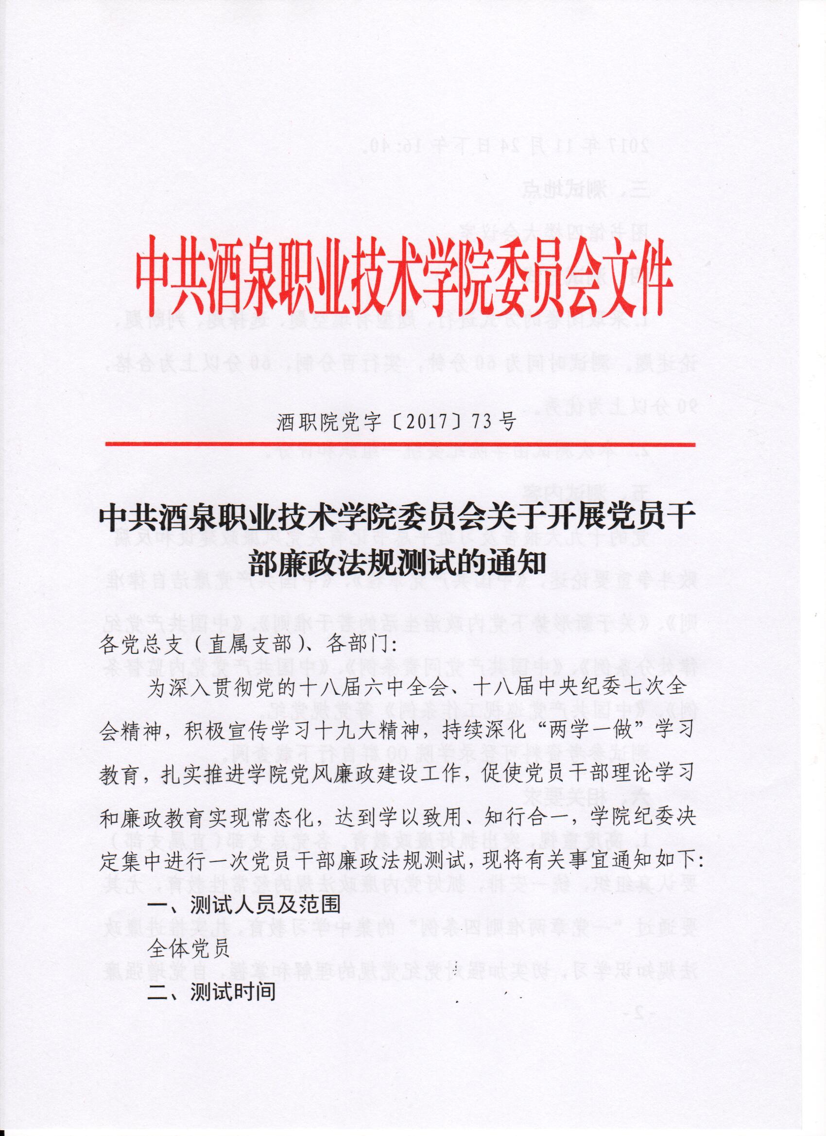 中共酒泉职业技术学院委员会关于开展党员干部廉政法规测试的通知