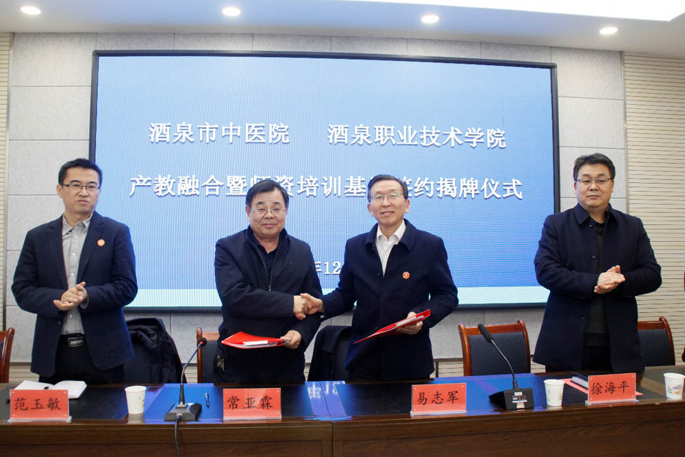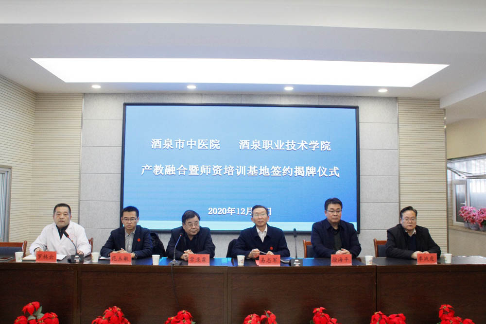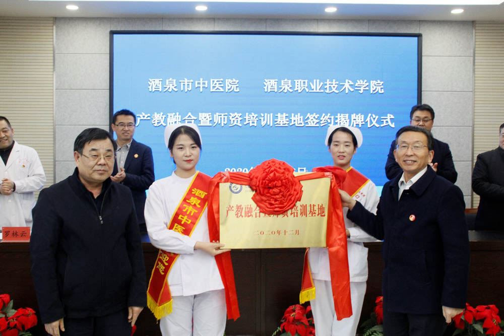为进一步深化办学体制和育人机制改革,促进专业适应产业发展需求,培养高素质技术技能复合型人才,2020年12月16日下午,酒泉职业技术学院与酒泉市中医院共建产教融合暨师资培训基地签约揭牌仪式在酒泉市中医院举行。学校党委书记、校长易志军,市政协副主席、酒泉市中医院院长常亚霖分别代表校院双方签订了合作协议。中医院全体院领导及中层参加了签约揭牌仪式。