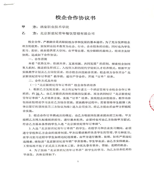 签订单-美与共。与北京新青年餐饮、绿地集团、蓝海酒店集团、北京宴等高水平企业签署订单培养协议120人,使人才培养全方位融入企业标准和企业课程,引进企业人员进校授课年均不少于60课时。企业支持学生学费人均4500元,建立了企业奖学金,形成了企业、学校、学生三方都受益的局面。