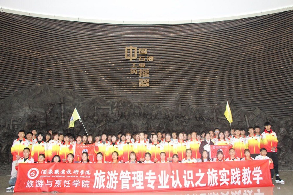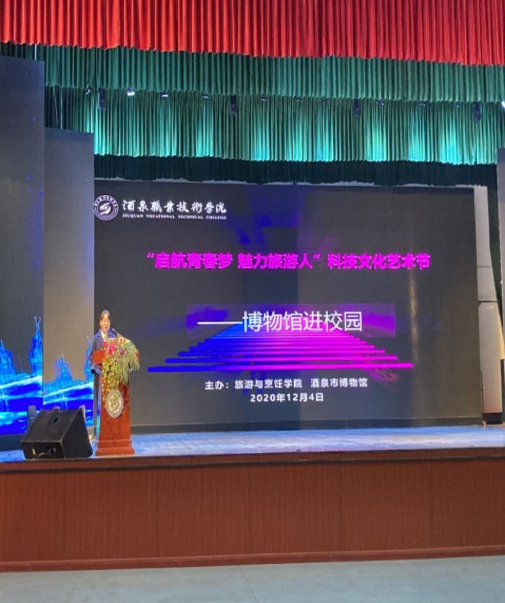 生进馆-馆进校。把旅游课堂搬进博物馆,先后走进酒泉博物馆 、玉门博物馆、敦煌博物馆等馆所进行现场教学,开展教研活动;先后邀请酒泉市博物馆王杰元、航天城展览馆编辑候冀等学者和优秀讲解员走进校内课堂,传播优秀传统文化。