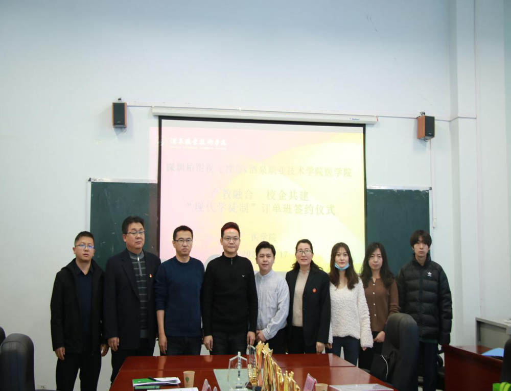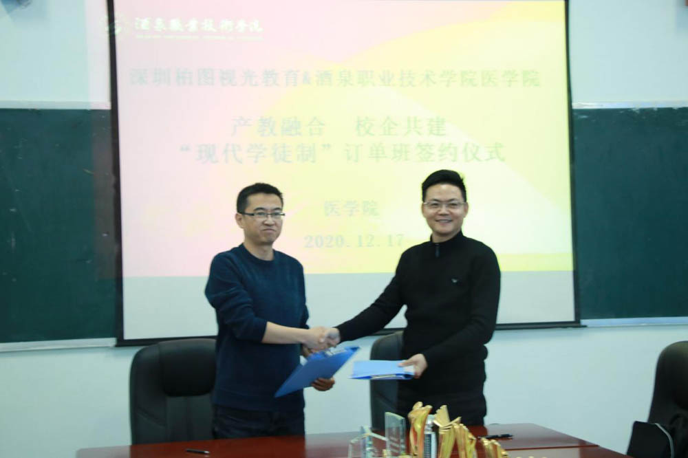 为进一步优化办学机制,推进育人模式改革,促进专业适应产业发展需求,培养适应新发展需求的高素质技能型人才,医学院于2020年12月17日在行知楼七楼会议室举行深圳柏图视光教育与酒泉职业技术学院医学院“现代学徒制”订单班签约仪式。医学院党支部书记、院长范玉敏,深圳柏图视光教育总经理陈长生分别代表校企双方签订了“现代学徒制”订单班协议,党支部副书记徐海平,副院长段国萍,副院长杨文龙及深圳柏图视光教育技术总监陈泓源,市场部主任王丹丹出席签约仪式。