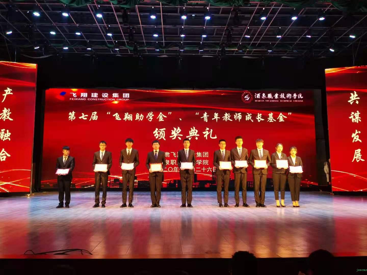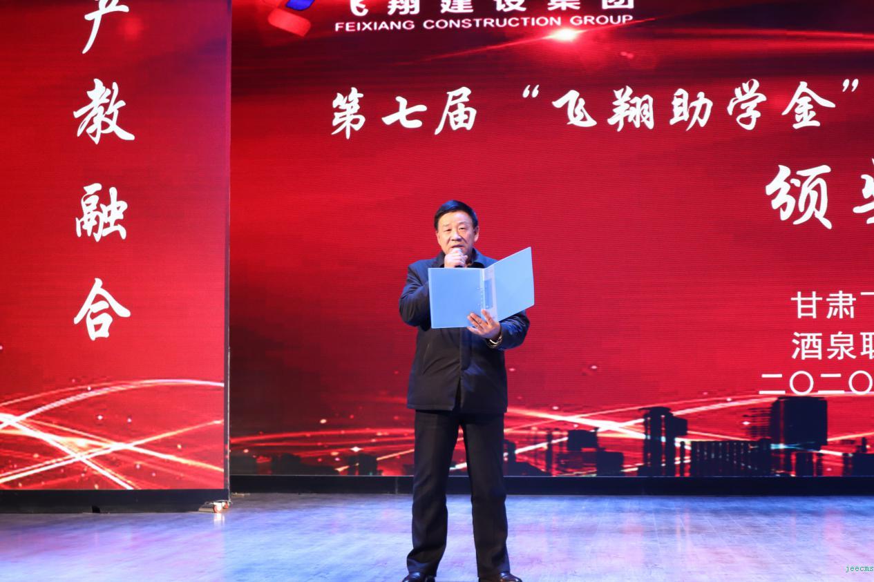 颁奖环节,甘肃飞翔建设集团有限公司总经理孙耀忠宣读了《关于校企联合表彰第七届飞翔助学金和青年教师成长基金获得者的决定》,甘肃飞翔建设集团有限公司党委书记、董事长魏强为学生代表颁发飞翔助学金,学校党委委员、纪委书记、省监委派驻学校监察专员魏韡为获得青年教师成才奖的团队和个人颁奖。