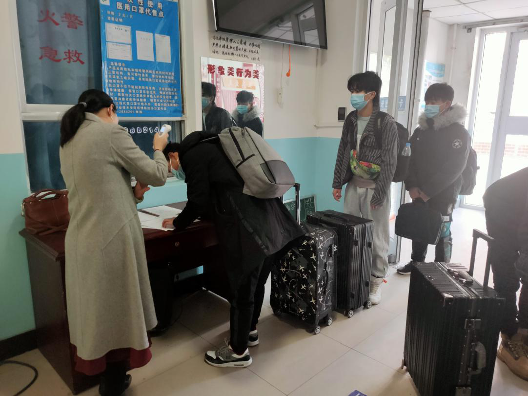 根据学校学生返校流程,返校学生到站后,在教师引导下乘坐接送专车返校,在公寓门口测温并进行个人及行李消毒方可入宿。