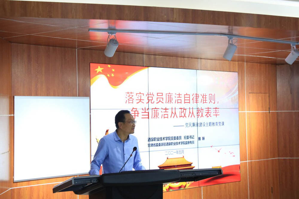 魏韡书记从“中国共产党廉洁自律准则”、“中国共产党廉洁自律准则和纪律处分条例四大意义”、“不忘立德树人初心,牢记为党育人,为国育才使命”、“树立新时期人民教师良好形象,争当廉洁从政、从教表率”等四个方面进行了阐述,结合发生在周边的实际案例,引导党员教职工坚守廉洁自律防线,筑牢立德树人根本任务,不断强化政治纪律和政治规矩,牢固树立“四个意识”,坚定“四个自信”,坚决做到“两个维护”用党的理论指导工作实践,推动我校工作再上一个新台阶。