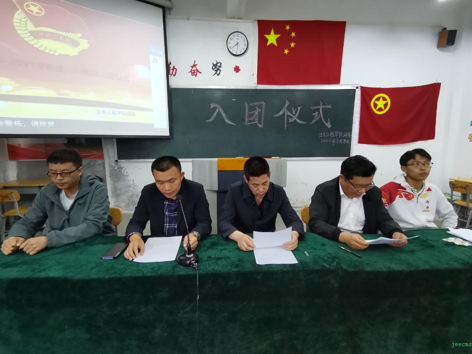 2021年5月18日下午5点,土木工程学院于行知楼108教室举行了入团仪式,本次入团仪式由院团委书记薛凌荣主持,土木工程学院党支部相关人员、学院副院长王会恩出席会议,参与本次会议的有团委副书记杨文辉、学生会主席滕振翔、组织部部长岩明晶及新入团成员。