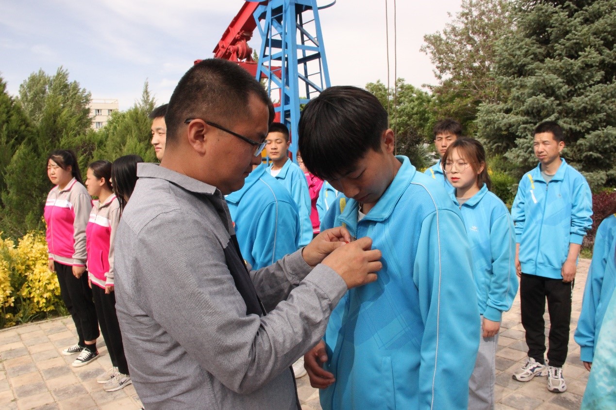 仪式上,本科教学部团委书记李卓颖讲解了入团的意义,宣读了新团员名单,祝贺9名同学成为光荣的中国共产主义青年团团员。新能源工程学院团委书记高翔领誓,新团员面向团旗庄严宣誓:“我志愿加入中国共产主义青年团,坚决拥护中国共产党的领导,遵守团的章程……”。三位老师为新团员佩戴团徽。